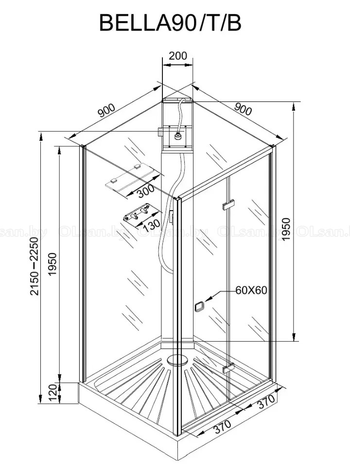 Размер: 90х90х215-225* см. Поддон — белый, акриловый, с бортиком по периметру, Профиля — алюминиевые, черного цвета из аннодированого алюминия, Переднее стекло — закаленное, прозрачное, толщиной 5 мм, Боковое неподвижное стекло — закаленное, прозрачное, толщиной 6 мм, Заднее стекло — закаленное, супер прозрачное с белой покраской, толщиной 5 мм, Без болтовое соединение, Центральная панель — черная, пластиковая, Верхний тропический душ — алюминиевый, с регулировкой высоты 5 см + 5 см (регулируется до установки), Смеситель и ручной душ — квадратной формы, в цвет профиля, Высококачественный шланг в оплетке из нержавеющей стали, Стеклянная полка с черной рамкой из нержавеющей стали, Ручка — металлическая, Петли в цвет профиля, В комплекте сифон анти-запах, Сборка универсальная (дверь можно установить как слева, так и справа).