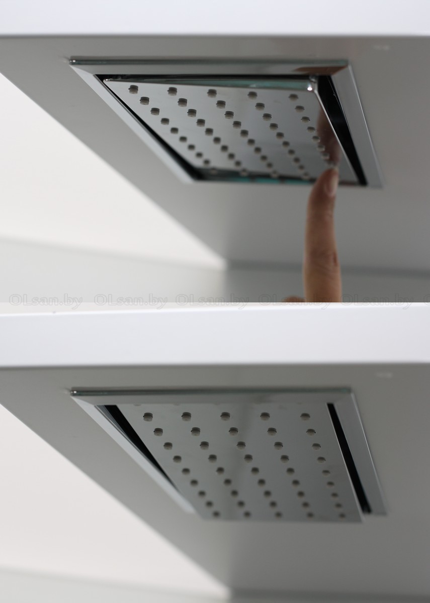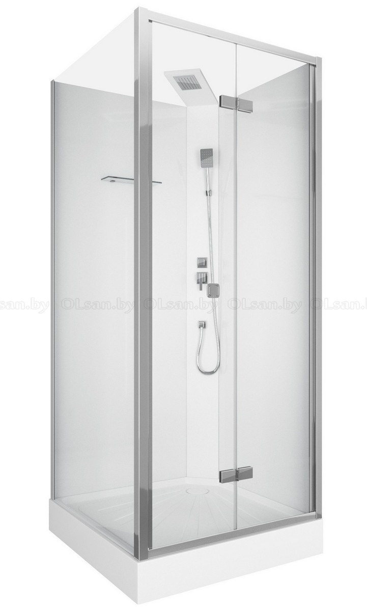 Размер: 90х90х215-225* см. Поддон — белый, акриловый, с бортиком по периметру, Профиля — алюминиевые, цвет хром, из аннодированого алюминия, Переднее стекло — закаленное, прозрачное, толщиной 5 мм, Боковое неподвижное стекло — закаленное, прозрачное, толщиной 6 мм, Заднее стекло — закаленное, супер прозрачное с белой покраской, толщиной 5 мм, Без болтовое соединение, Центральная панель — белая, пластиковая, Верхний тропический душ — алюминиевый, с регулировкой высоты 5 см + 5 см (регулируется до установки), Смеситель и ручной душ — квадратной формы, в цвет профиля, Высококачественный шланг в оплетке из нержавеющей стали, Стеклянная полка с рамой по краю из нержавеющей стали, Ручка — цинковый сплав, Петли из цинкового сплава, В комплекте сифон анти-запах, Сборка универсальная (дверь можно установить как слева, так и справа).