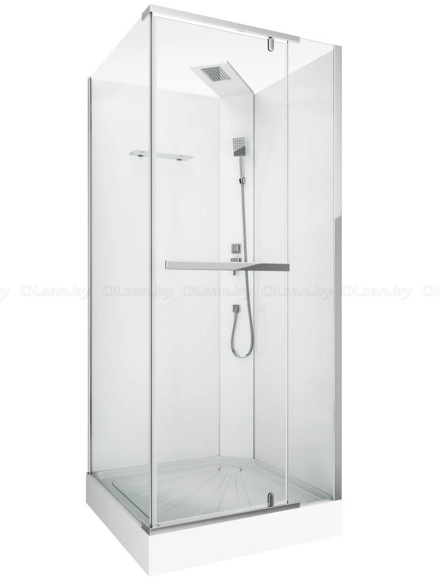 Поддон - белый из ABS-пластика с бортиком по периметру. Профиль боковой - хромированный из аннодированого алюминия. Профиль сверху и снизу - хромированный из нержавеющей стали. Передние и боковые стекла - закаленные, прозрачные, толщиной 6 мм. Задние стекла - закаленные, прозрачные с белой покраской, толщиной 5 мм. Безболтовое соединение. Центральная панель - белая пластиковая. Верхний душ - алюминиевый с регулировкой высоты 5 см + 5 см (регулируется до установки). Смеситель хром. Квадратный ручной душ metel, с шлангом с оплеткой из нержавеющей стали. Полка и сифон "анти-запах" в комплекте. Дизайнерская ручка выполнена из стали, имеет длину 42 см. Петли из цинкового сплава. Сборка универсальная (право-/левосторонняя).