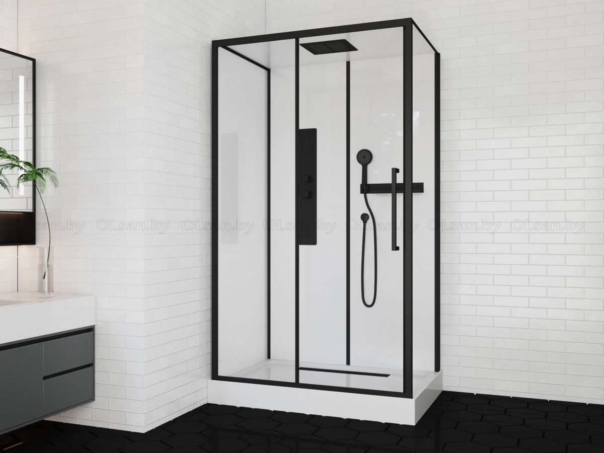 Размер (120x80x210). Поддон из ABS-пластика, белый, высотой 12 см, глубина 4см, Диаметр сливного отверстия 70мм; профиль - черный алюминиевый; стекло переднее закаленное прозрачное, толщиной 6 мм; боковое - закаленное прозрачное, толщиной 5 мм; заднее - супер белое закаленное, толщиной 5 мм. Комплектация: смеситель; полка; держатель ручного душа; пластиковые ручки черные, в цвет профиля; двойной верхний и одинарный нижний ролики; сифон анти-запах в комплекте.
