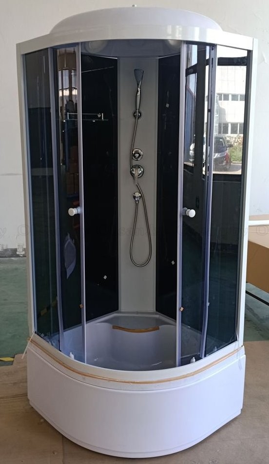 Размер: 85х85х215 см. Профиль - Белый, алюминиевый; Центральная панель - Белый цвет, пластик; Конструкция дверей – Раздвижные; Материал и толщина стекла, мм – 4; Цвет стекла – тонированное; Задние стенки, материал и толщина стекла - Окрашенное каленое черное стекло 4 мм; Комплектация: Тропический и ручной душ, полка стеклянная, вентиляционная решетка.