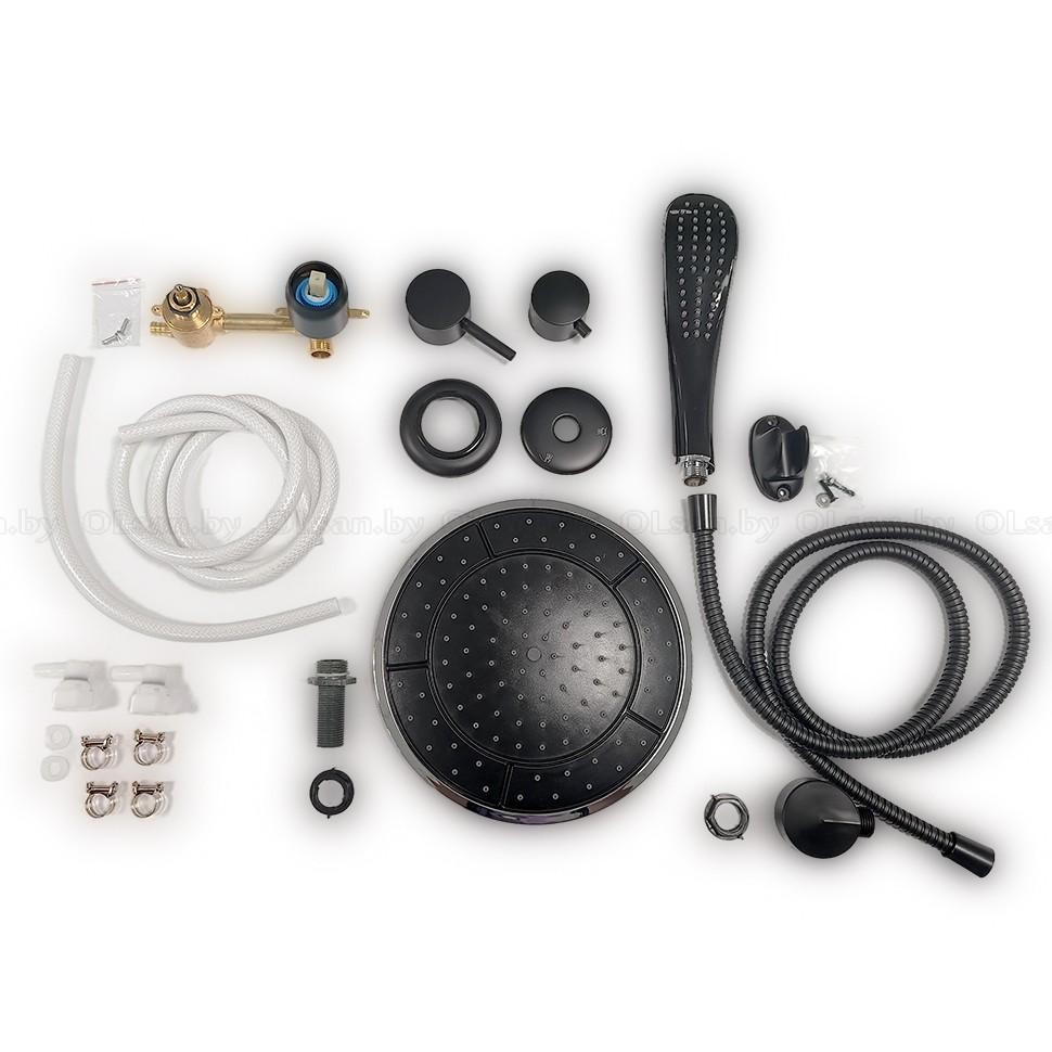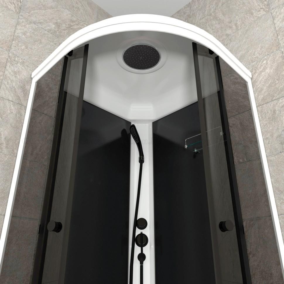 В комплекте: Поддон душевой со съемным экраном; Каркас для поддона стальной; Передние стекла; Передние двери; Комплект направляющих; Задние стенки; Центральная душевая панель; Крыша; Смеситель с лейкой и тропическим душем; Сифон; Сборочный комплект. Глубина поддона 200 мм; сифон душевой кабины 50 мм (click-clack); ширина дверного проёма 570 мм; рисунок стекол тонированные.