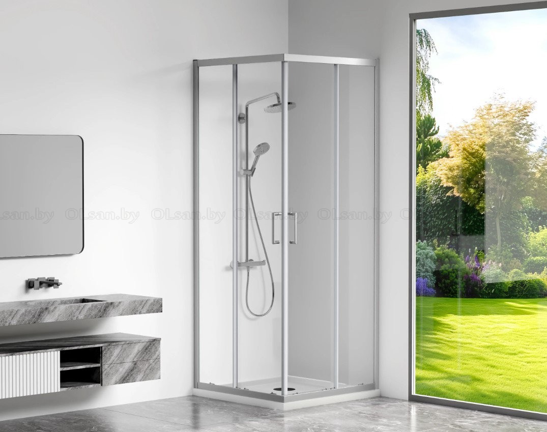 Выполнены из 5-ти миллиметрового прозрачного закаленного, безопасного стекла, с подвижными дверками; высота ограждений 1900 мм; профиль исполнен в двух цветовых вариантах: CH – хром, B – чёрном; обрамление выполнено из анодированного алюминиевого профиля с высококачественным покрытием; нижние ролики с механизмом отстёгивания обеспечивают легкий доступ к стеклу и профилям для очистки. Габариты: 1000x1000x1900; Диапазон регулировок: (990-1010)x(990-1010)x1900; Ширина входа: 578 мм.