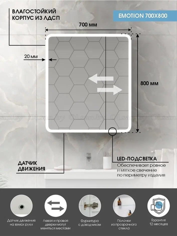 Зеркало-шкаф КОНТИНЕНТ Emotion LED 700х800 с датчиком движения