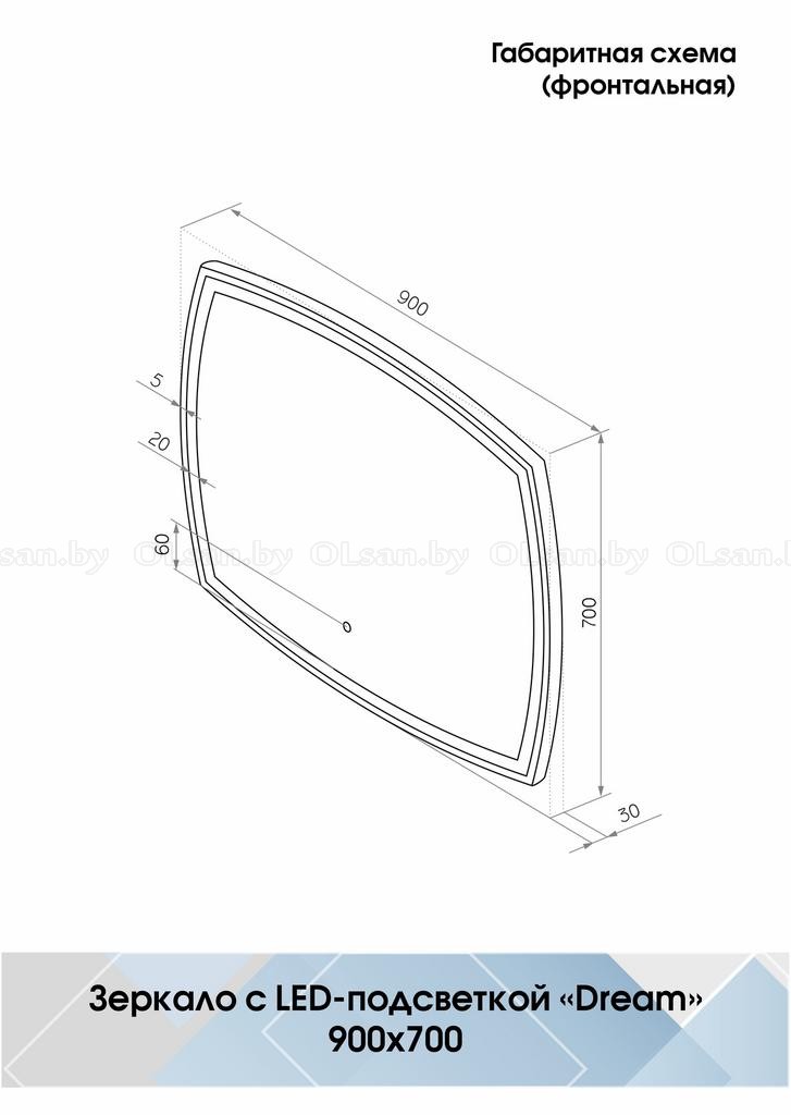 Размер: 900*700 мм . Материал корпуса: пластик. Зеркальное полотно: AGC Glass Europe 4 мм. Температура свечения LED: 2700K. Тип светодиодов: 2835(120). Электропитание: 220V/50Hz. Класс защиты: IP44. Стандартная комплектация: ореольная теплая подсветка; cенсорное управление.