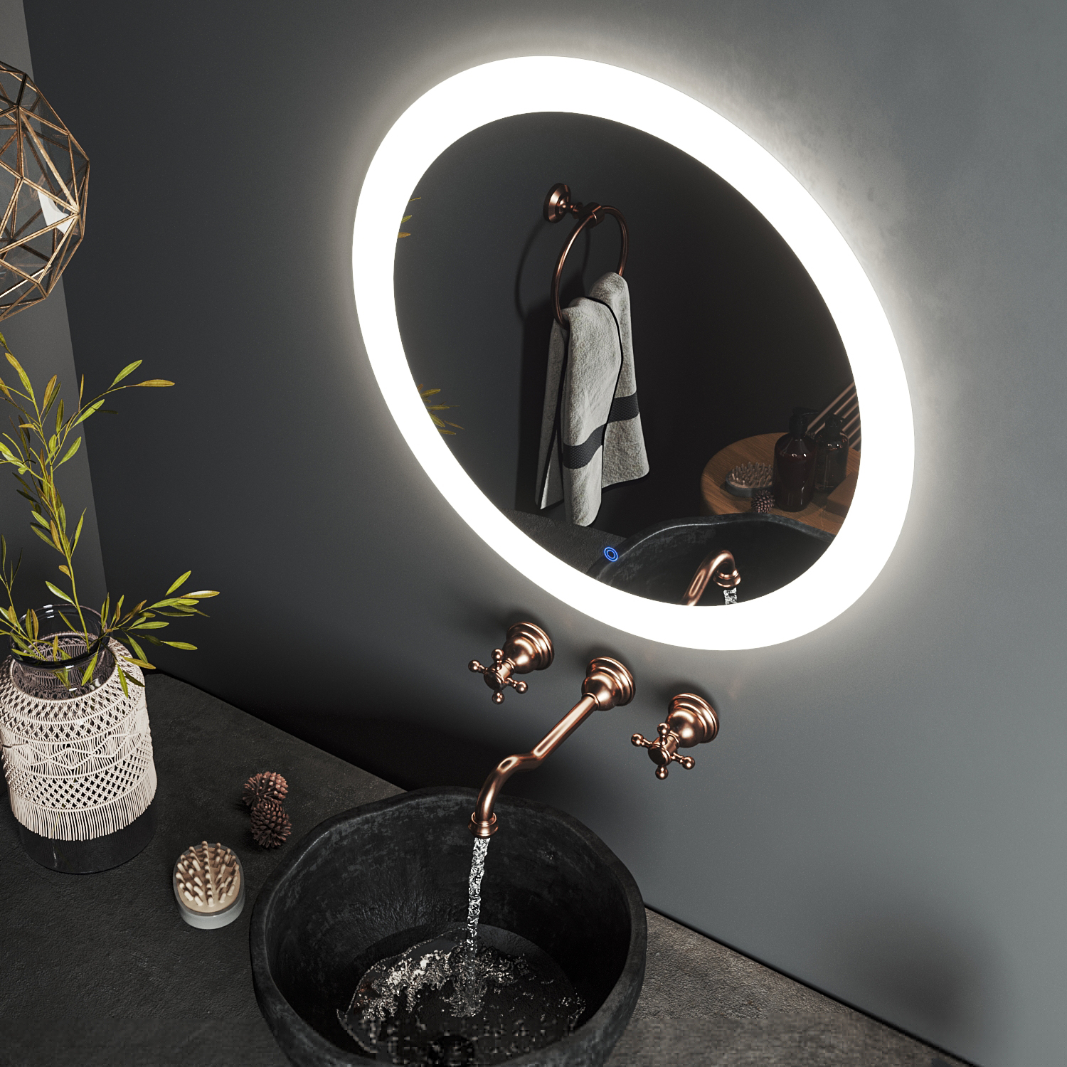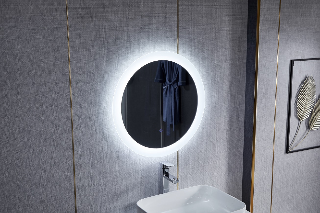 Зеркало Roxen Adema - классическая круглая модель с широкой (7 см) LED-подсветкой по контуру зеркала и сенсорным выключателем. Подсветка зеркала располагается так, что создается эффект рамки, которая выполняет функцию полноценного светильника, а так же создается эффект "парящего зеркала" за счет рассеивания света по стене.