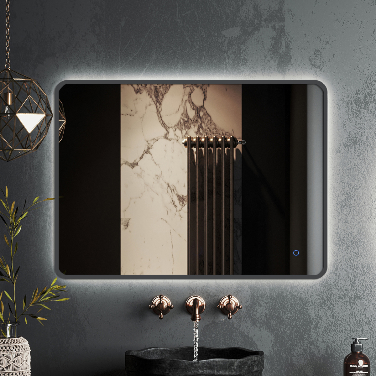 Зеркало Roxen Simon - модель в алюминиевой раме цвета оружейная сталь с ореольной LED-подсветкой на 3 цвета свечения. Такая необычная подсветка рассеивается по стене и дает эффект "парящего зеркала". Сенсорная кнопка SmartTouch срабатывает при легком касании, имеет возможность регулировки яркости свечения (Dimmer). Модель имеет 3 цвета свечения: холодный, теплый и нейтральный, каждый цвет так же регулируется по яркости. Благодаря удобному расположению кнопки включения и продуманной системе креплений вы можете расположить зеркало горизонтально либо вертикально и создать свой неповторимый интерьер.