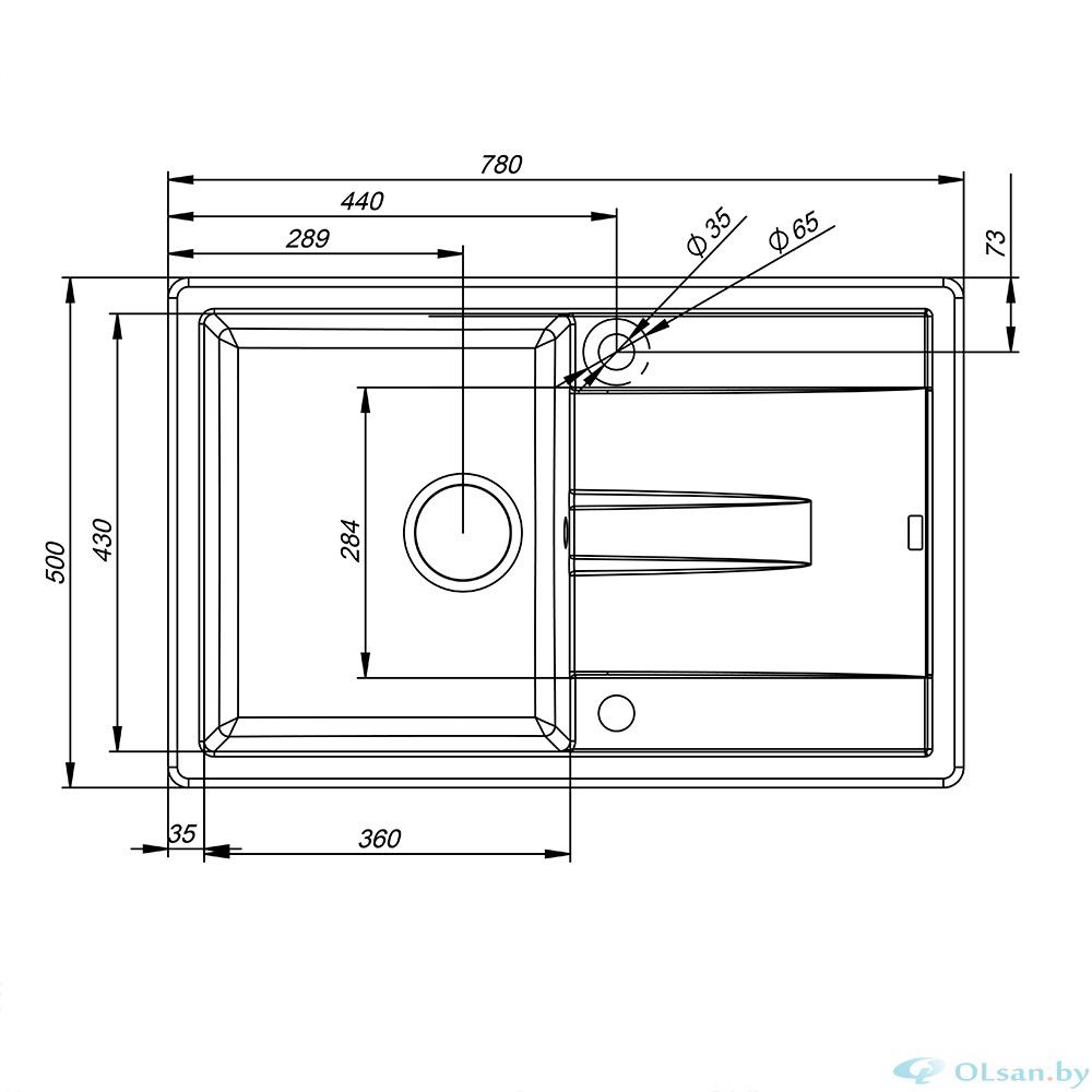 Комплектация: сифон, выпуск 3 1/2”, клапан-автомат, крепления, шаблон выреза 758 х 478 мм. Ширина шкафа: от 50 см. Особенность: перелив на чаше, отверстие под смеситель.