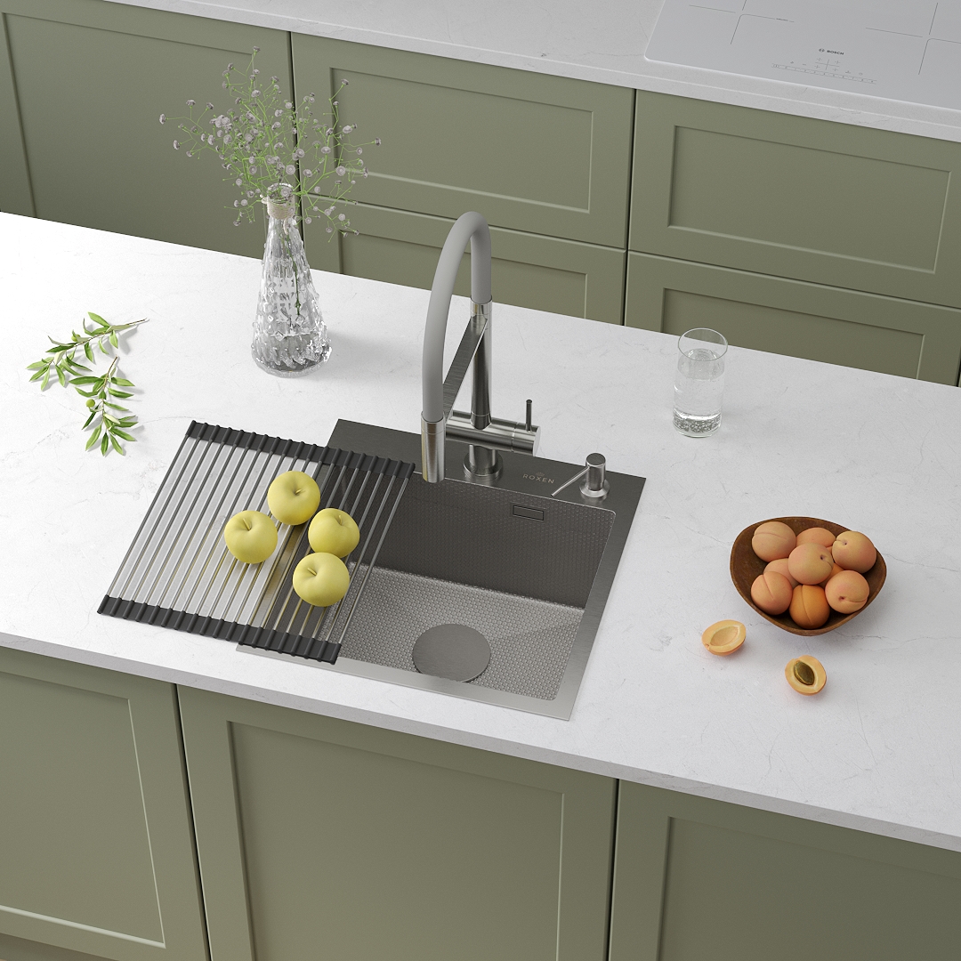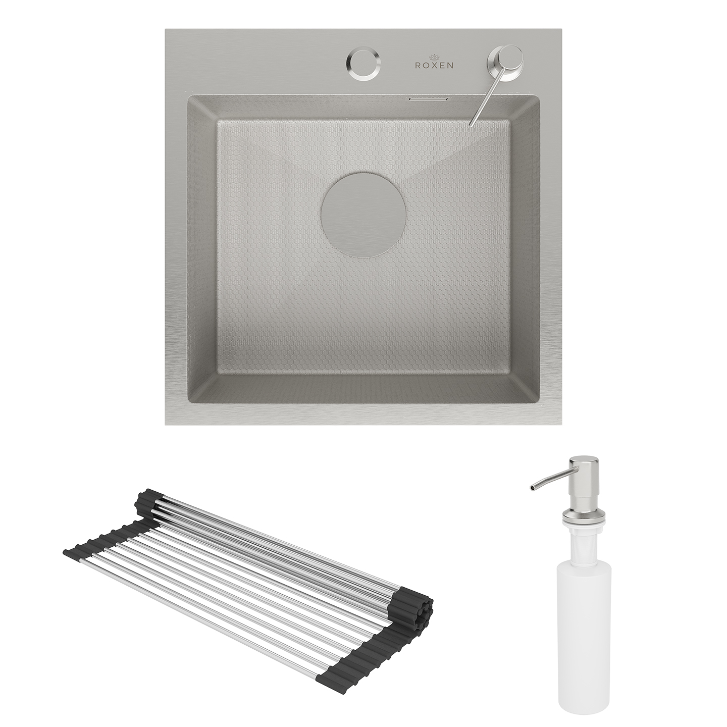 Кухонная мойка Roxen Snake 45х45 (текстурное покрытие) с ролл-матом и дозатором в комплекте. Современная вместительная модель премиального сегмента с глубокой чашей и широким отверстием слива, сочетает в себе стильный современный дизайн и отличные эксплуатационные характеристики. Мойка изготовлена из аустенитной низкоуглеродистой стали марки AISI 304, которая обладает устойчивостью к коррозии, окислению и перепаду температур. Толщина стали исключает деформацию и обеспечивает долгий срок эксплуатации. Уникальное покрытие Bruch Tech является защитным слоем, устойчивым к истиранию, появлению царапин и механических повреждений. Отличные шумопоглощающие характеристики мойки обеспечиваются шумоподавляющим составом Silent Protection и шумопоглощающими пластинами Soft Silence, которые располагаются по всей чаше мойки.