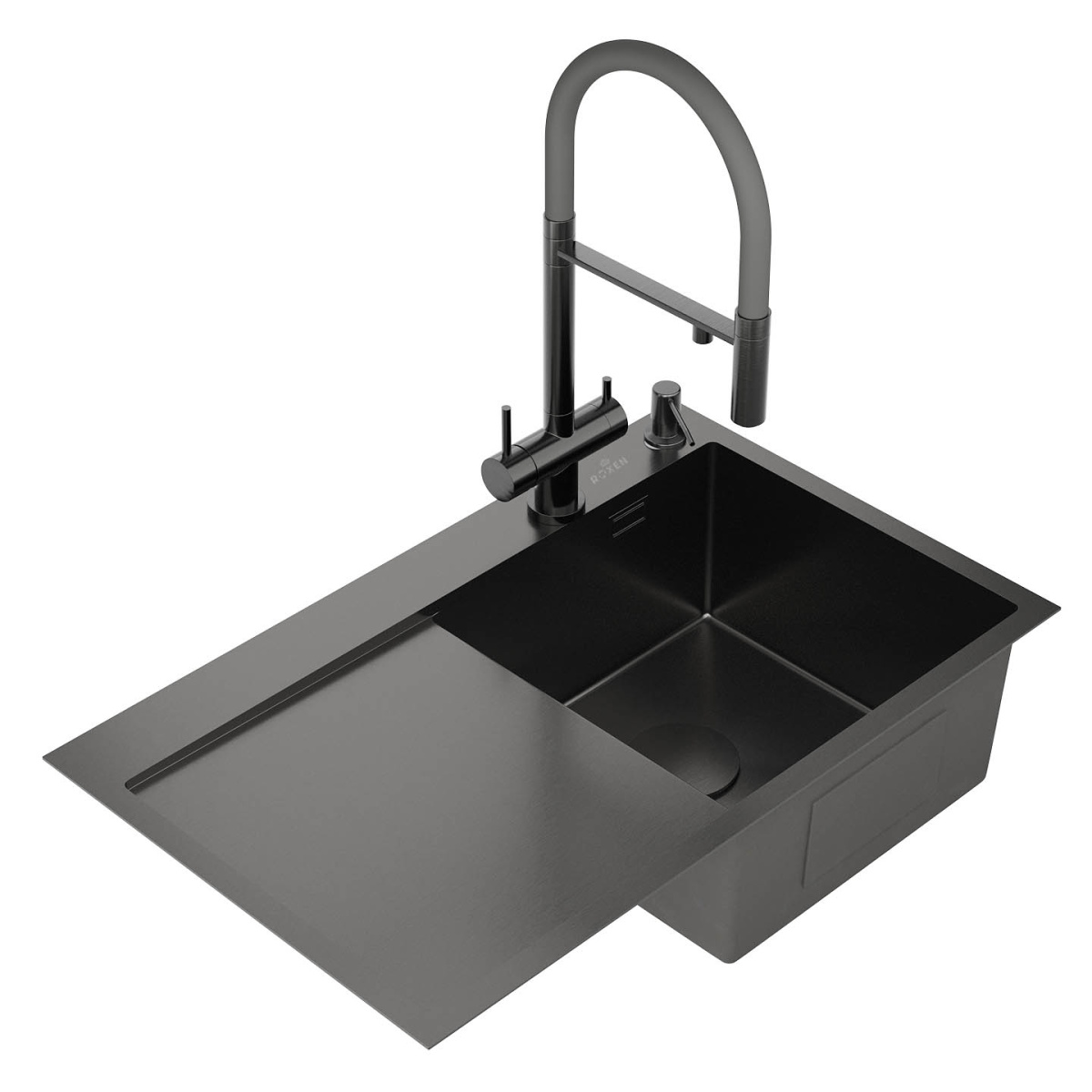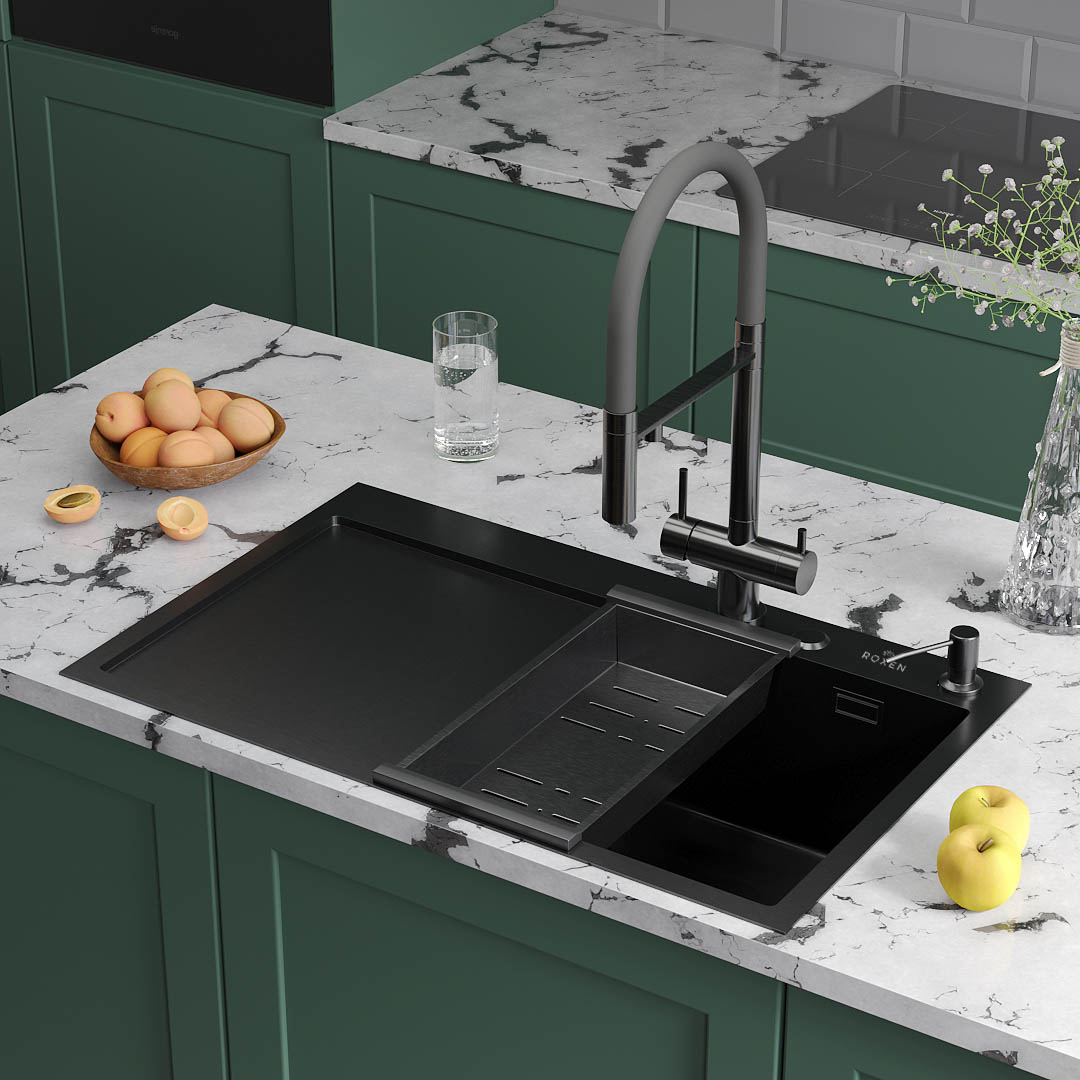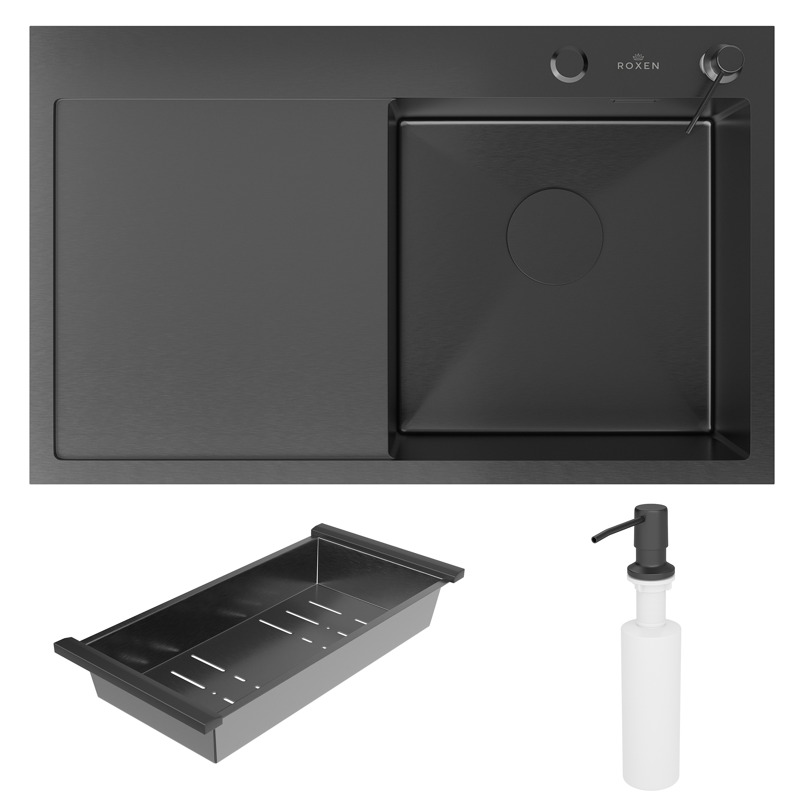 Кухонная мойка Roxen Vespa 78 PVD (графит) правосторонняя с коландером и дозатором в размере 78х48. Удобная и практичная модель с крылом в цвете графит, сочетает в себе стильный современный дизайн и отличные эксплуатационные характеристики. Мойка изготовлена из аустенитной низкоуглеродистой стали марки AISI 304, которая обладает устойчивостью к коррозии, окислению и перепаду температур. Отличные шумопоглощающие характеристики мойки обеспечиваются шумоподавляющим составом Silent Protection и шумопоглощающими пластинами Soft Silence, которые располагаются по всей чаше мойки.