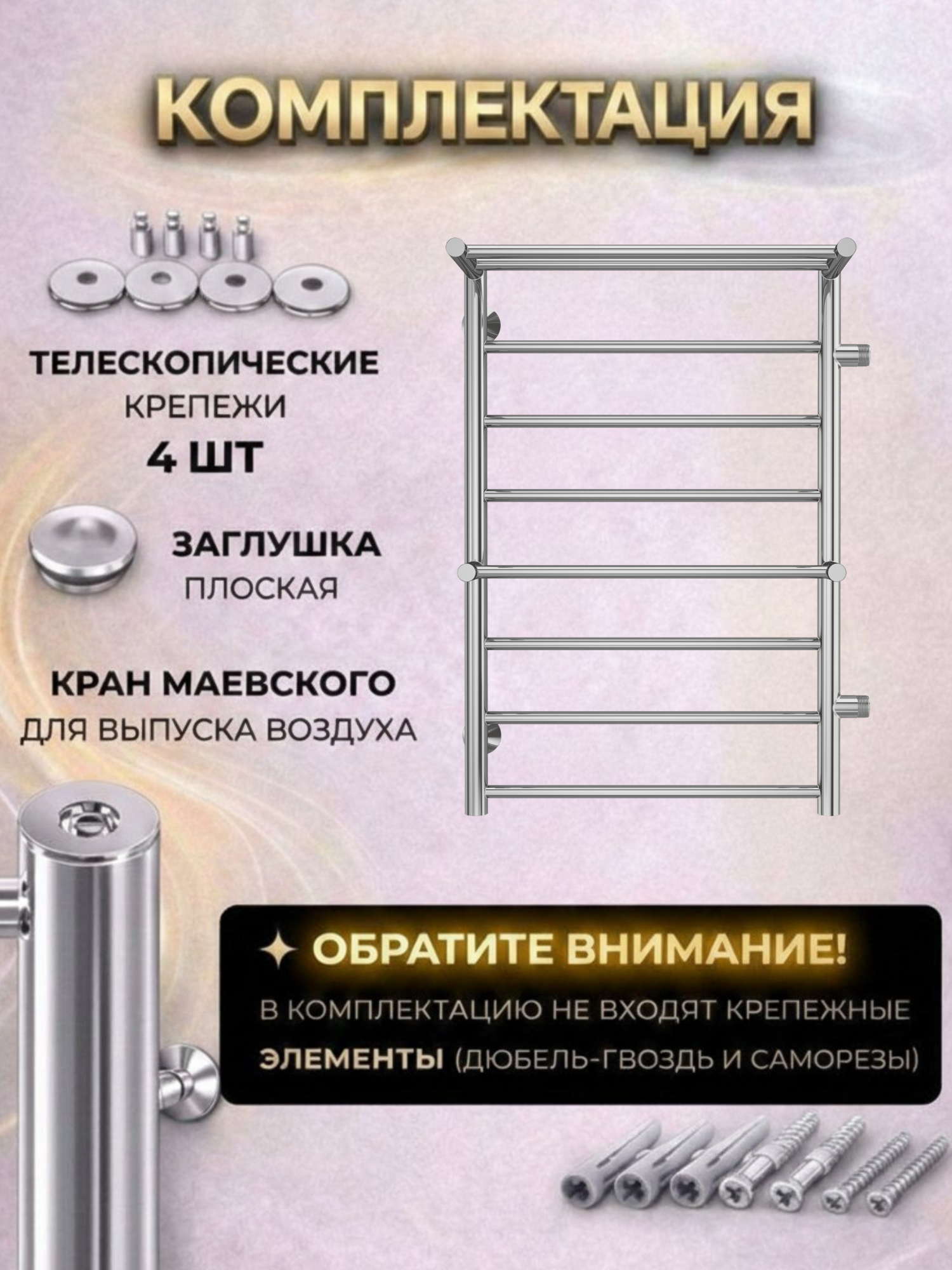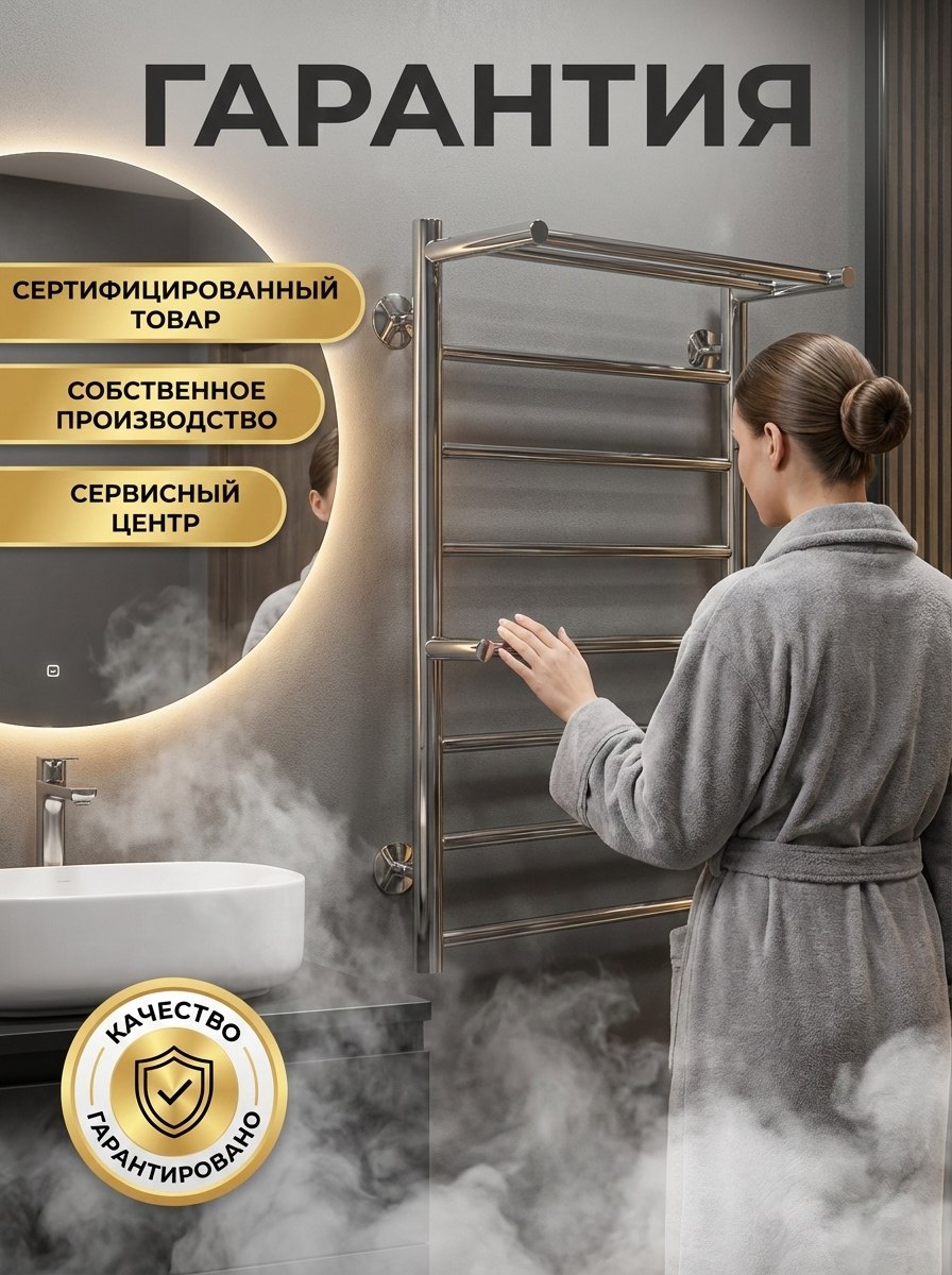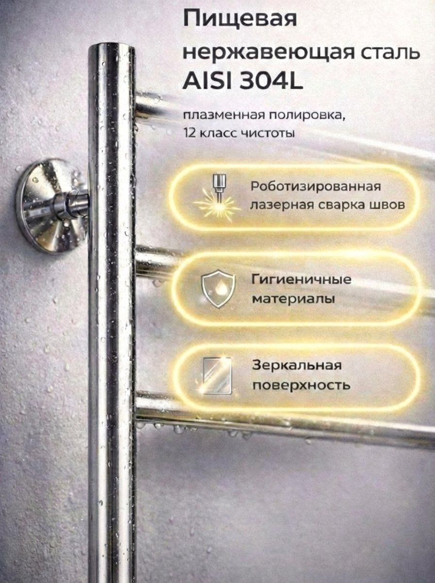 Пищевая нержавеющая сталь марки AISI 304L. Вид обработки: плазменная полировка. Конструкция: вертикальные стойки d 32 мм, горизонтальные перекладины d 18 мм. Комплект поставки: телескопические держатели к стене, кран Маевского, заглушки, паспорт изделия.