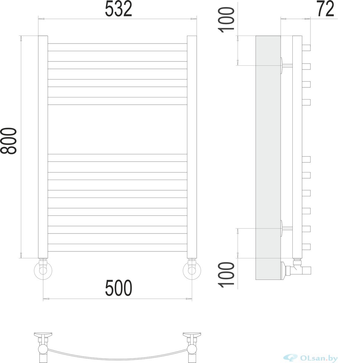 Пищевая нержавеющая сталь марки AISI 304L. Вид обработки: плазменная полировка. Конструкция: вертикальные стойки d 32 мм, горизонтальные перекладины 30х10 мм. Комплект поставки: Комплект уголок со сгоном 3/4х1/2 г/ш (2шт)+ эксц.(2шт), отраж.(2шт) ,телескопические держатели к стене, кран Маевского, заглушка, паспорт изделия.