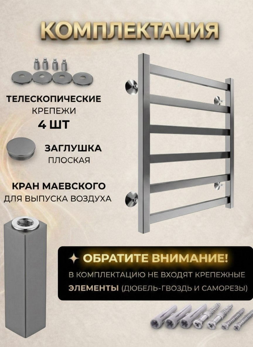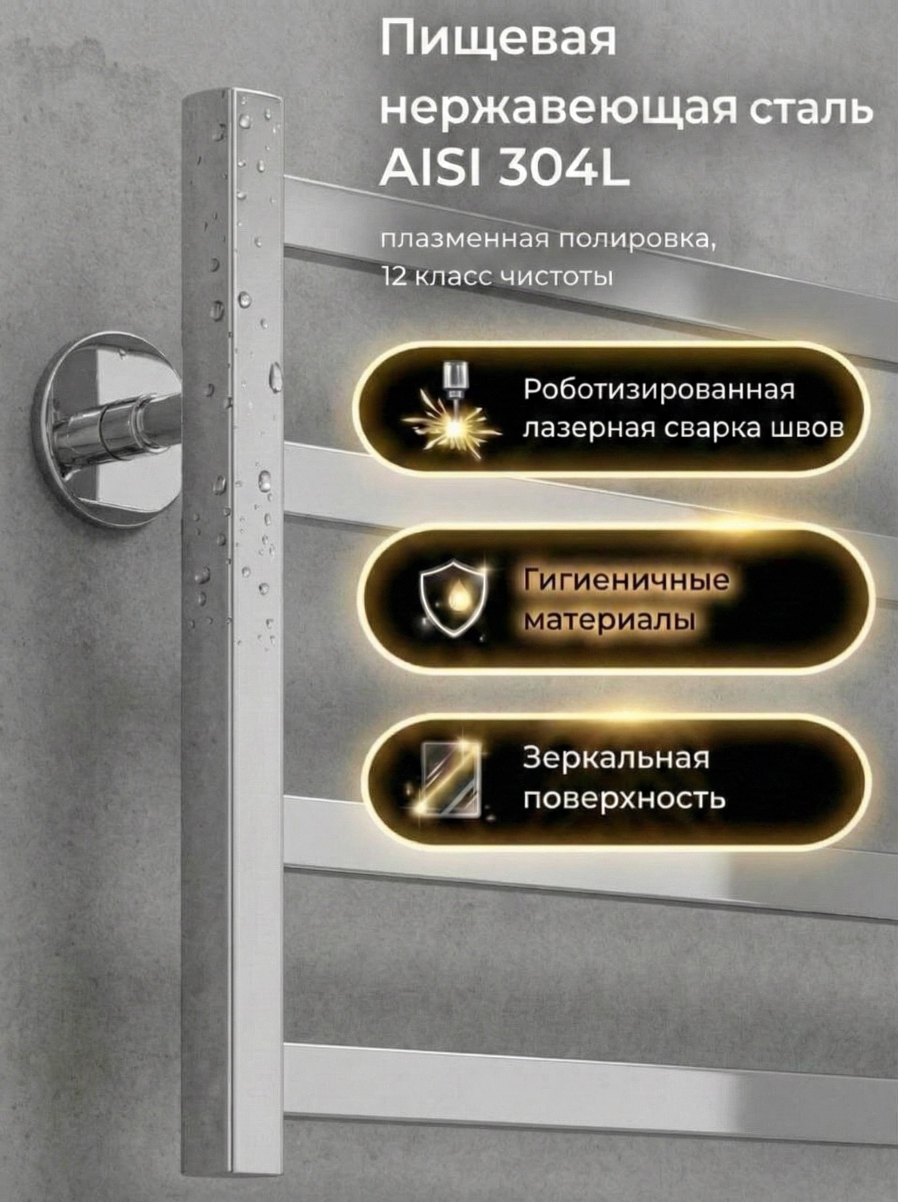 Пищевая нержавеющая сталь марки AISI 304L. Вид обработки: плазменная полировка. Комплект поставки: телескопические держатели к стене, кран Маевского, паспорт изделия.