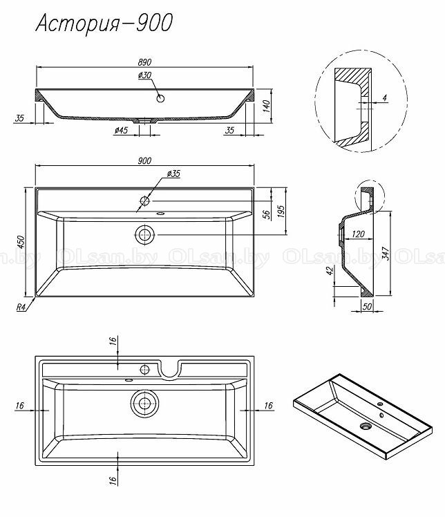 Монтаж на мебель или на столешницу. Встраиваемая сверху. Материал: искусственный мрамор. Донный клапан и сифон необходимо приобрести отдельно.