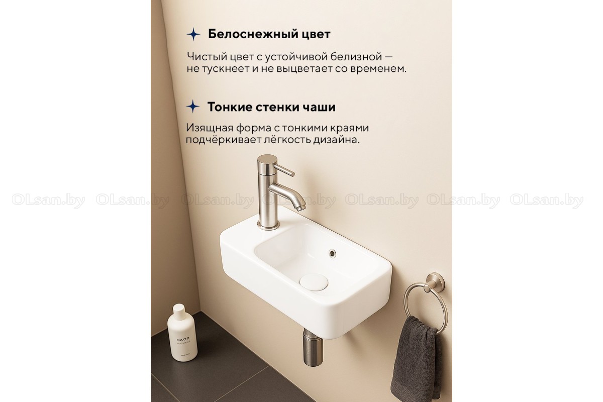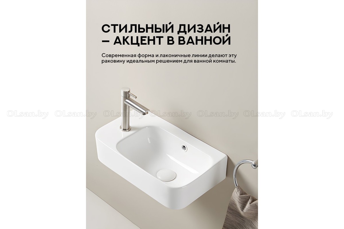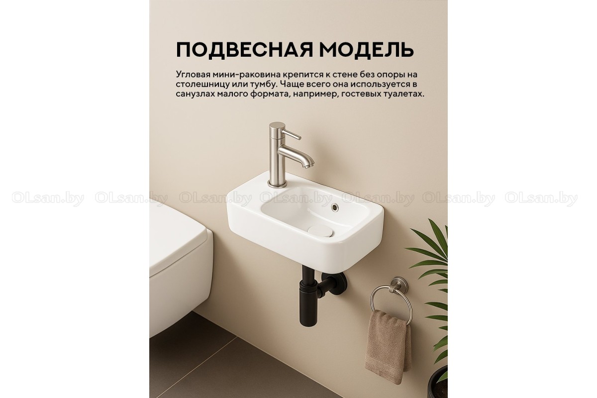 Компактная угловая раковина с тонкими краями. Установка осуществляется в подвесном режиме, что обеспечивает удобство и аккуратность в интерьере.
