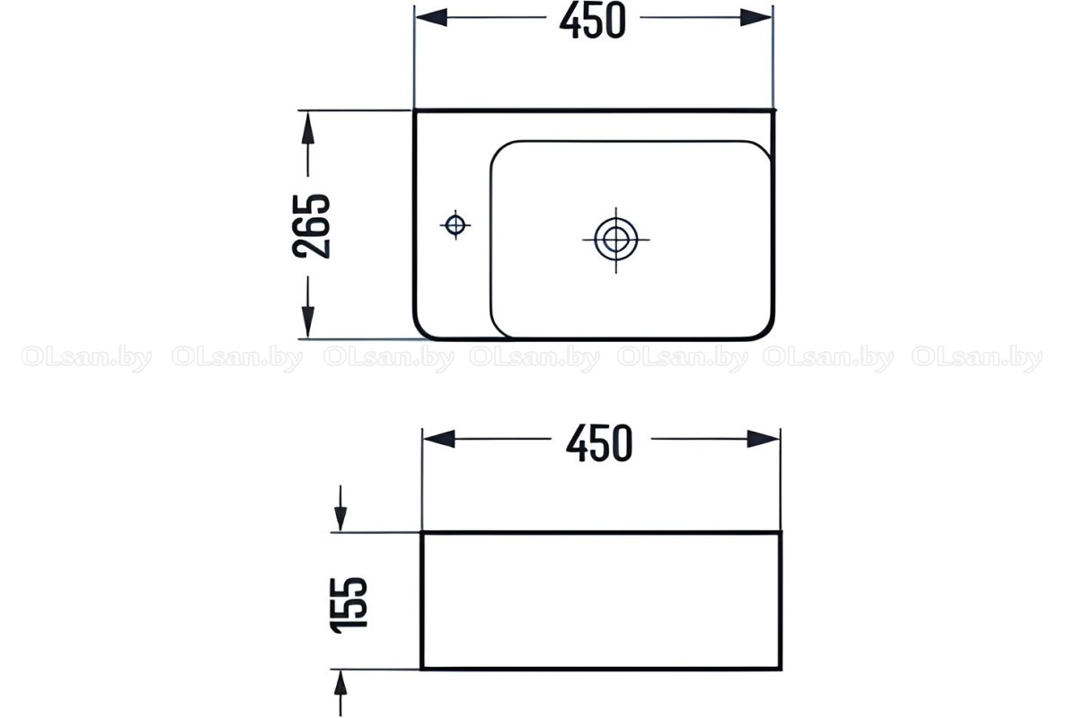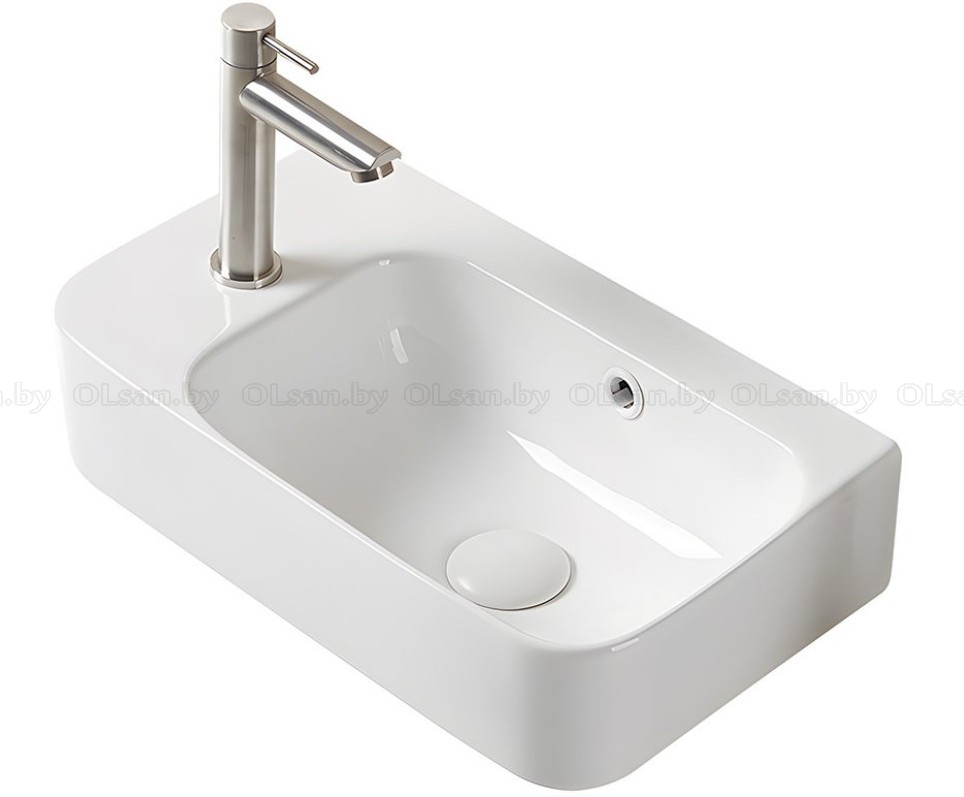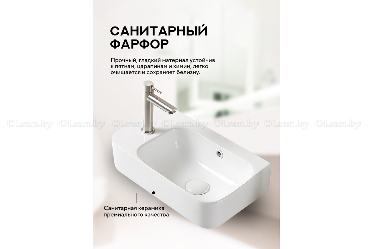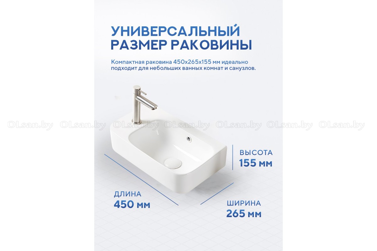 Компактная угловая раковина с тонкими краями. Установка осуществляется в подвесном режиме, что обеспечивает удобство и аккуратность в интерьере.