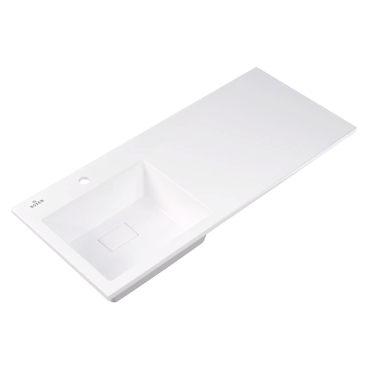 Умывальник Roxen Faber 110L 30010110L-W — функциональная прямоугольная модель с увеличенными габаритами, предназначенная для установки на тумбу или стиральную машину. Особенностью данной модели является левостороннее расположение чаши, что позволяет рационально организовать пространство и обеспечить удобство использования. Изделие выполнено из прочного искусственного камня, устойчивого к влаге, перепадам температур и механическим нагрузкам. Материал сохраняет идеально белую поверхность без желтизны и пористости.