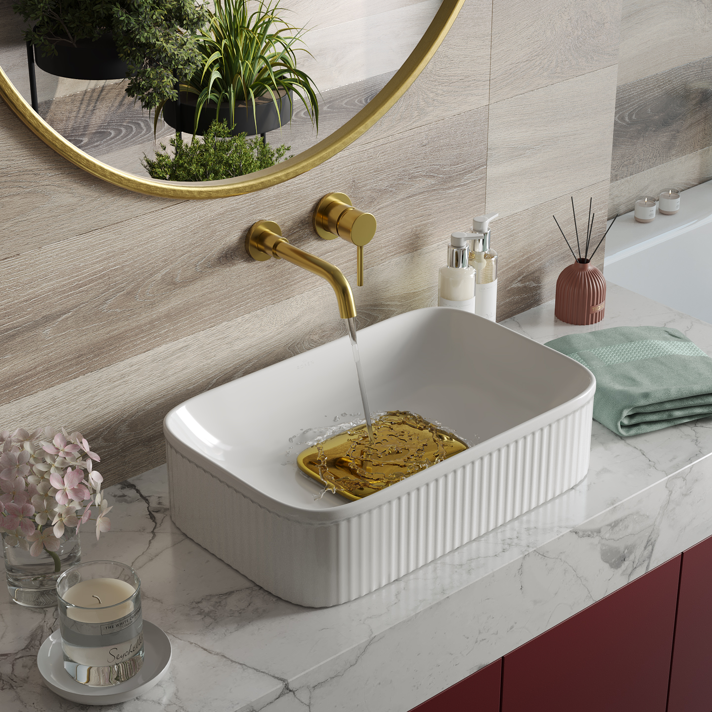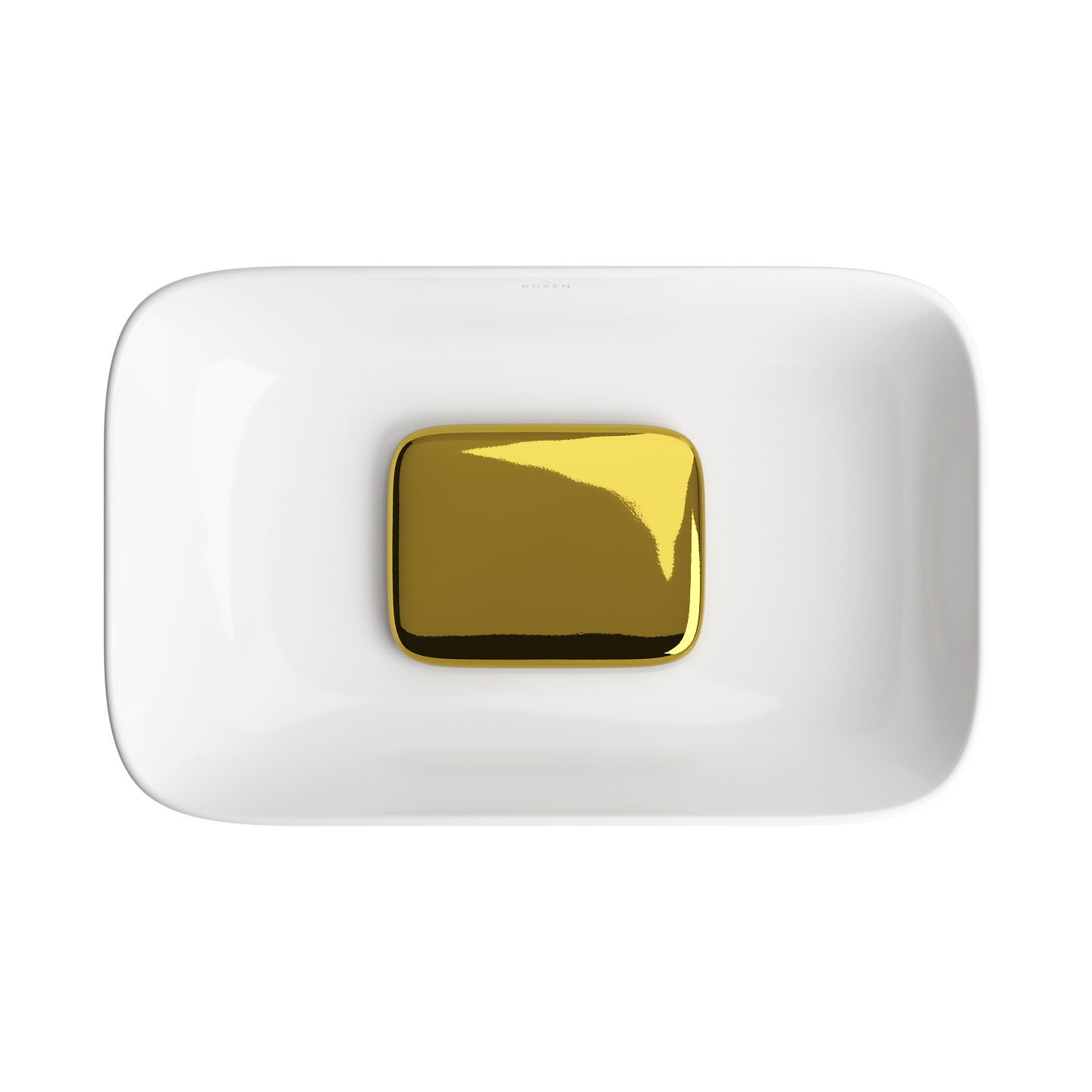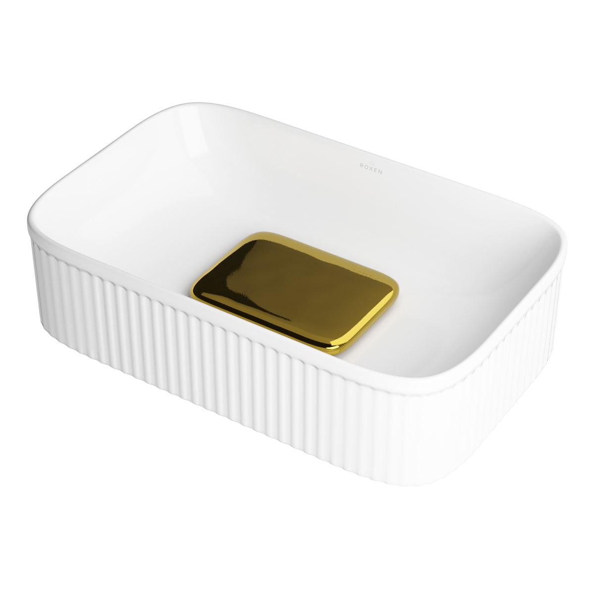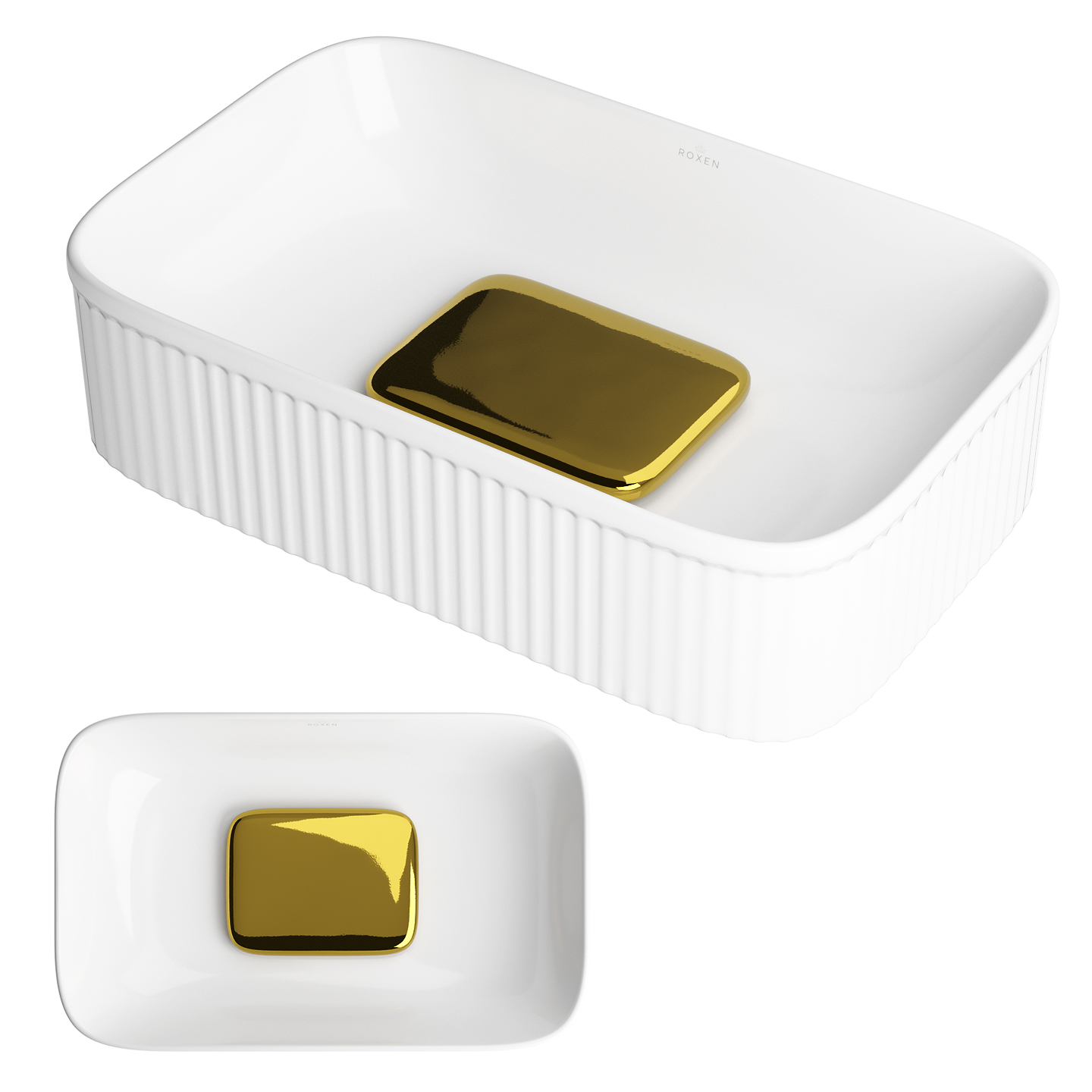 Умывальник Roxen Pablo Gold 570205 - модель в современном дизайне c декоративной накладкой золотого цвета, для установки на столешницу. Умывальник изготовлен из санитарного фарфора PorCelain, который обеспечивает прочность изделия, абсолютную белизну и гладкую поверхность. Благодаря уникальному процессу шлифовки (машинная + ручная) достигается отсутствие пор и углублений. Специальное антибактериальное покрытие Ultra Glide обеспечивает легкий уход, гигиеничность и первоначальный внешний вид на долгие годы. Оптимальная высота чаши удобна в использовании и не позволяет каплям воды попадать на столешницу.