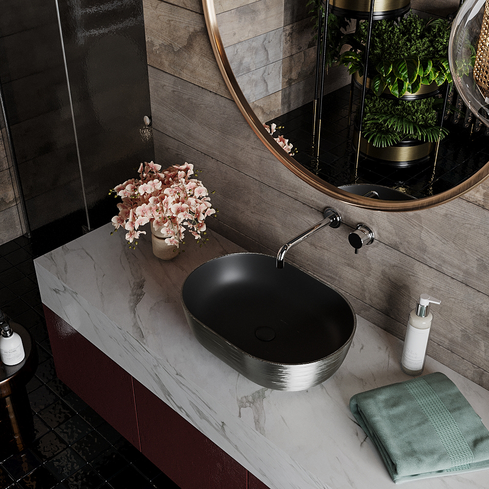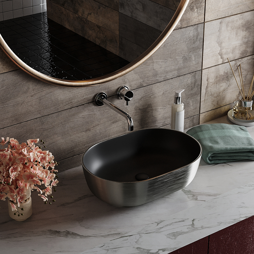 Умывальник Roxen Sandra 570195-B - оригинальная модель в черном матовом цвете с серебристой внешней отделкой, для установки на столешницу. Умывальник изготовлен из санитарного фарфора PorCelain, который обеспечивает прочность изделия и гладкую поверхность. Благодаря уникальному процессу шлифовки (машинная + ручная) достигается отсутствие пор и углублений. Специальное антибактериальное покрытие Ultra Glide обеспечивает легкий уход, гигиеничность и первоначальный внешний вид на долгие годы. Оптимальная высота чаши удобна в использовании и не позволяет каплям воды попадать на столешницу.