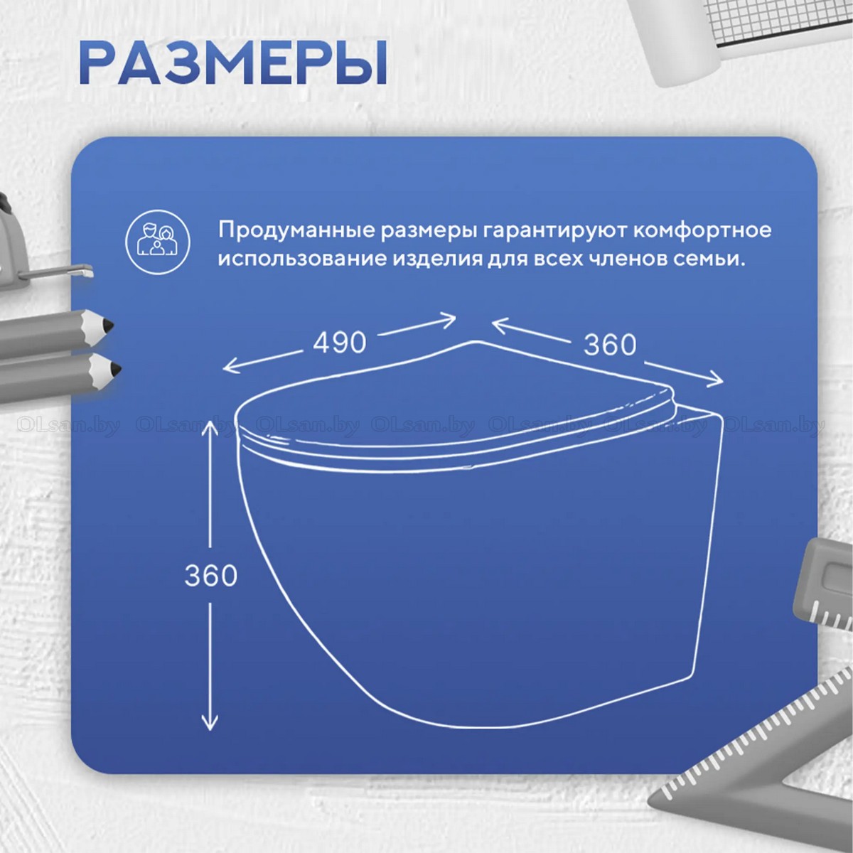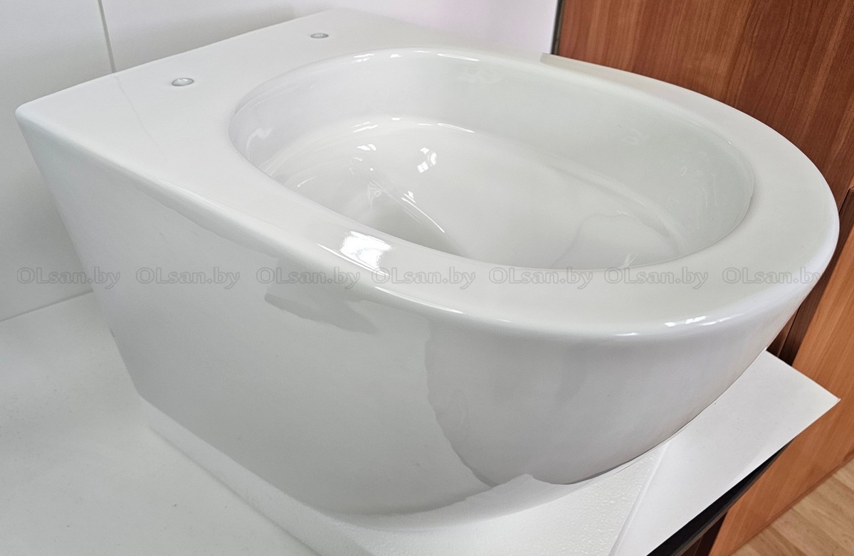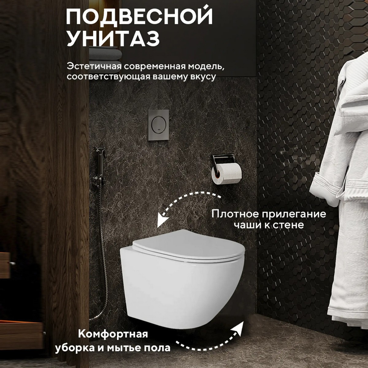Подвесной компактный унитаз, тонкая крышка Soft close с функцие1 быстросъема, безободковая чаша с антибактериальным покрытием, круговой смыв, материал - сантехнический фарфор, материал крышки - дюропласт. Технология смыва "Торнадо".