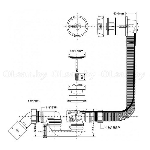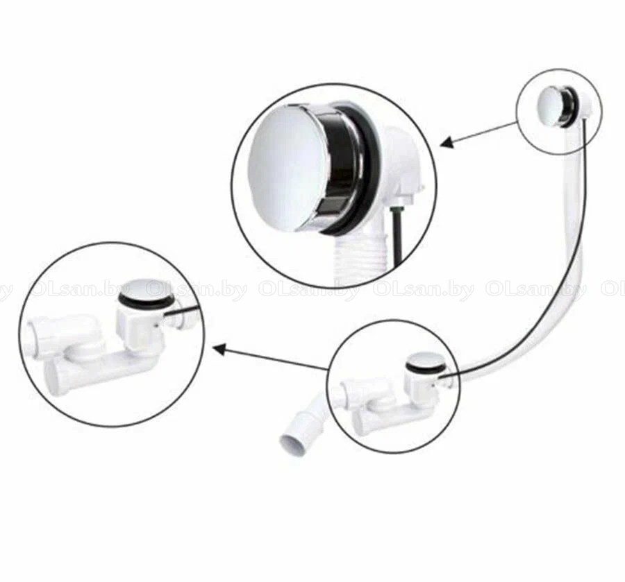 Сифон для ванны слив-перелив полуавтомат (трос). Регулируемый слив-перелив 700мм. Вывод в канализацию 40/50 мм.
