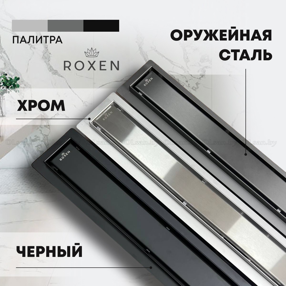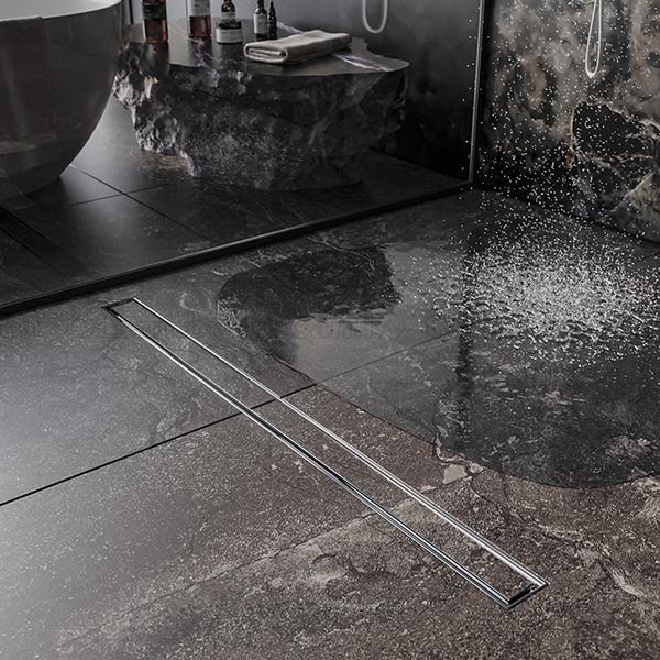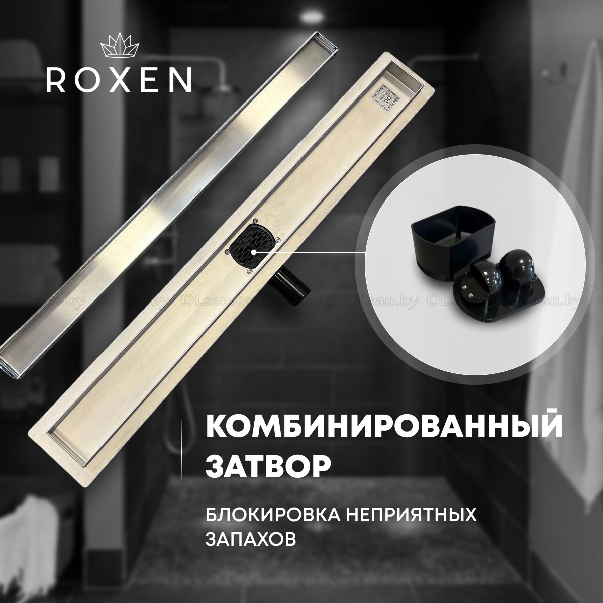 Комплект водоотводящего желоба ROXEN SUPRA: водоотводящий желоб, сифон, двухсторонняя съемная решетка, регулируемые ножки, переходник DN40/50, водонепроницаемая мембрана, крюк для демонтажа.