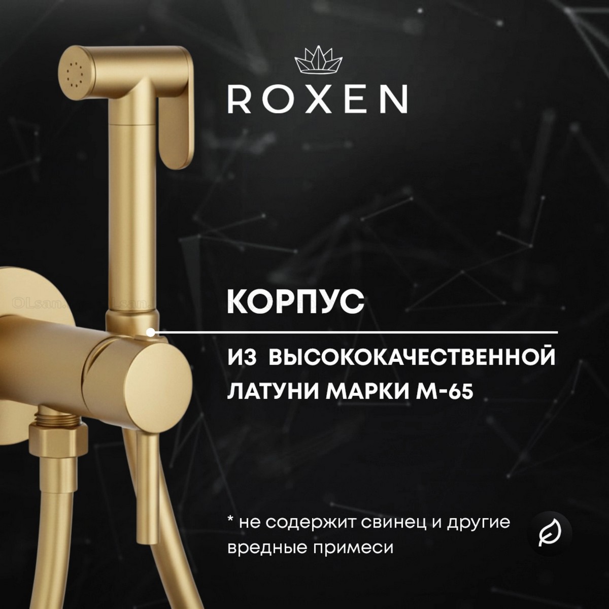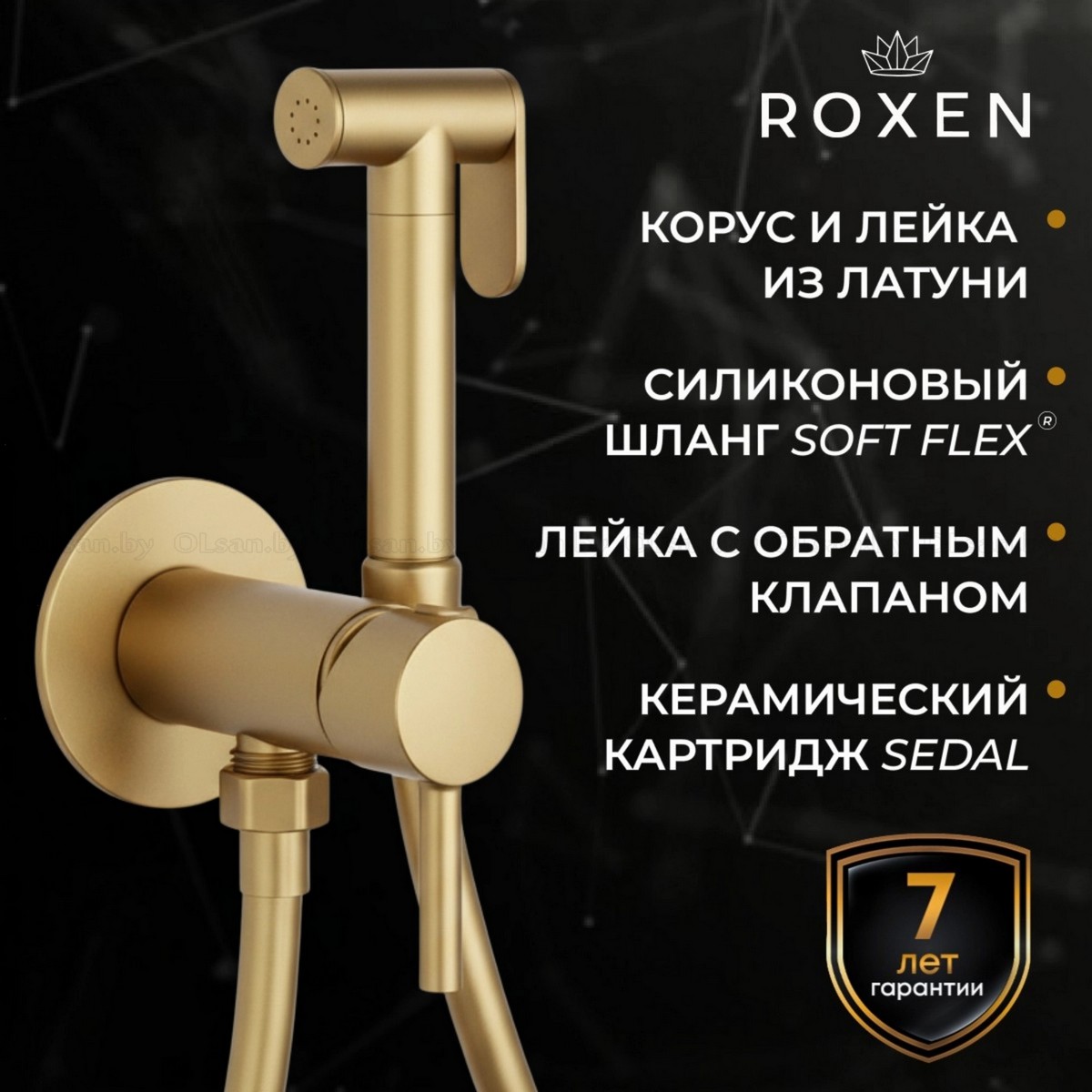 Материал: латунь; лейка с обратным клапаном; силиконовый шланг с защитой от перекручивания 130см; керамический картридж Sedal; Цвет: брашированное золото.