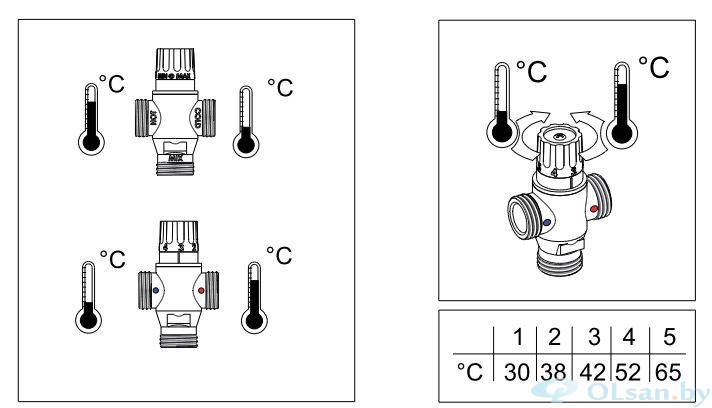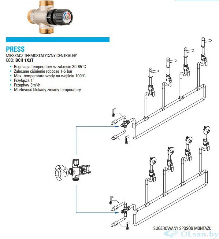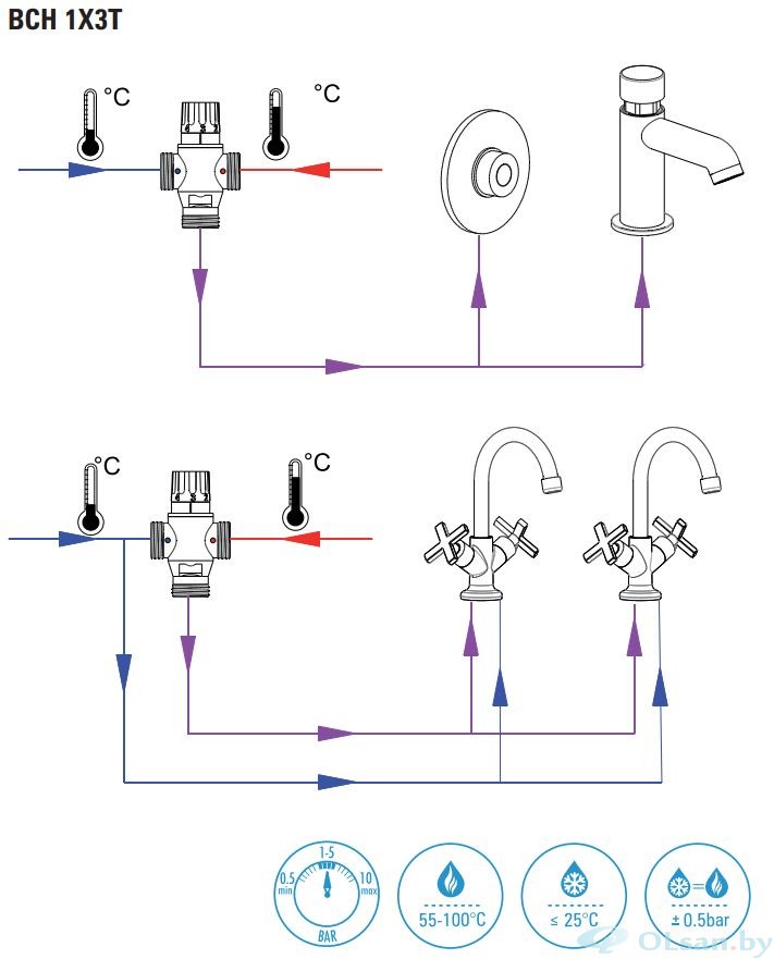 Возможность блокировки изменения температуры. Максимальная температура воды на входе 100°C. Присоединение 1". Регулировка температуры в пределах 30-65°C. Рекомендованное рабочее давление 1-5 bar. Проточность 3куб.м/ч. BBH 028L/BCH 028L можно подключить к 4 душевым смесителям при минимальном давлении воды при входе 3 bar. BBH 048L/BCH 048L можно подключить к 4 душевым смесителям при минимальном давлении воды при входе 3 bar.
