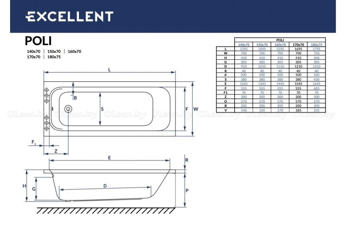 Ванна акриловая EXCELLENT POLI 150x70, 160x70, 170x70