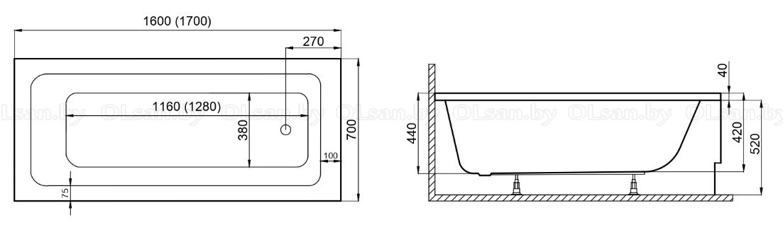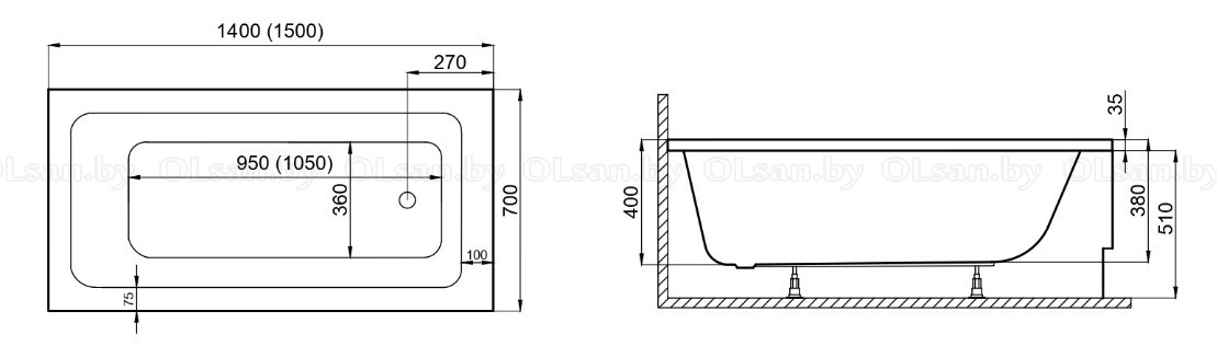 Ножки в комплекте. За дополнительную плату можно укомплектовать панелью под ванну. Для ванны 150x70: 00556 Передняя панель Polimat 150х51 см, белая; 00558 Боковая панель Polimat 70х51 см, белая. Для ванны 170x70: 00602 Передняя панель Polimat 170х52 см, белая; Боковая панель Polimat 70х52 см, белая.